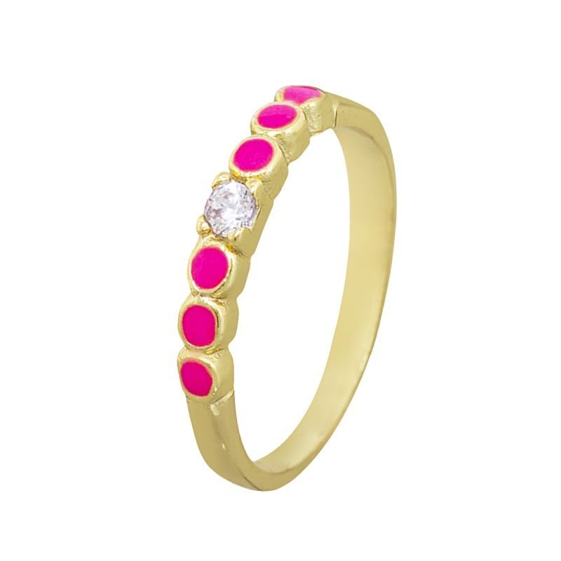 Anel com 3 bolinhas de cada lado resinadas na cor rosa e com uma zirconia central. Modelinho delicado e muito versátil, ideal para as meninas que gostam de peças únicas. Semijóias banhadas em ouro 18k, antialérgicas e com um ano de garantia.