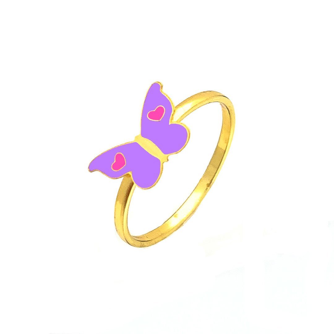 Anel infantil de Borboletinha delicada resinada em lilás com coração rosa. Semijoia banhada á ouro 18k revestida com uma camada exclusiva de verniz antialérgico.
