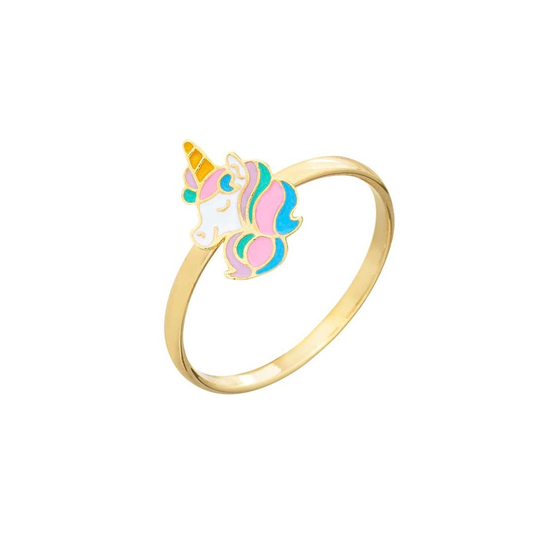 Anel infantil de unicórnio colorido resinado colorido, com formato lúdico. Semijoia banhada á ouro 18k revestida com uma camada exclusiva de verniz antialérgico.