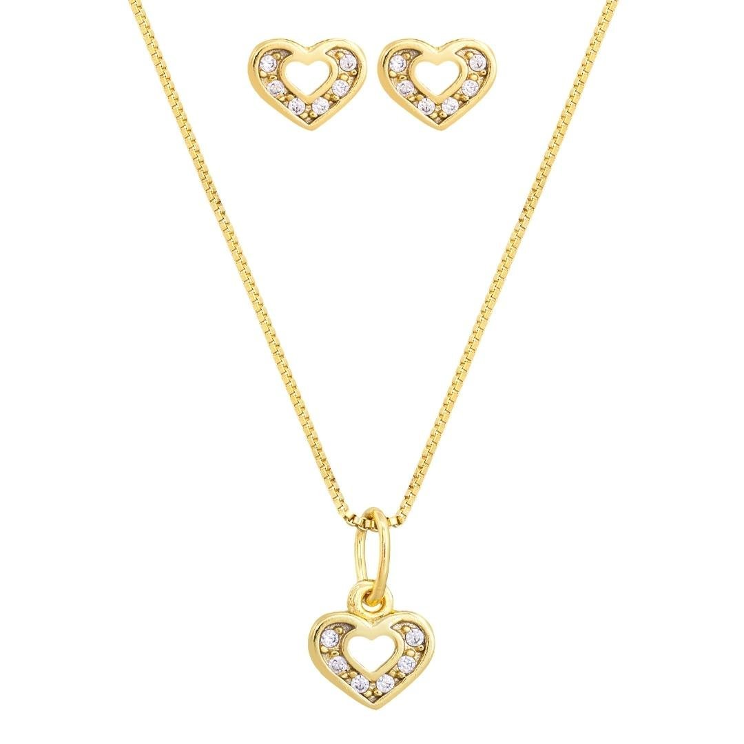 BRINCO E COLAR CORAÇÃO CRAVEJADO - BANHADO À OURO