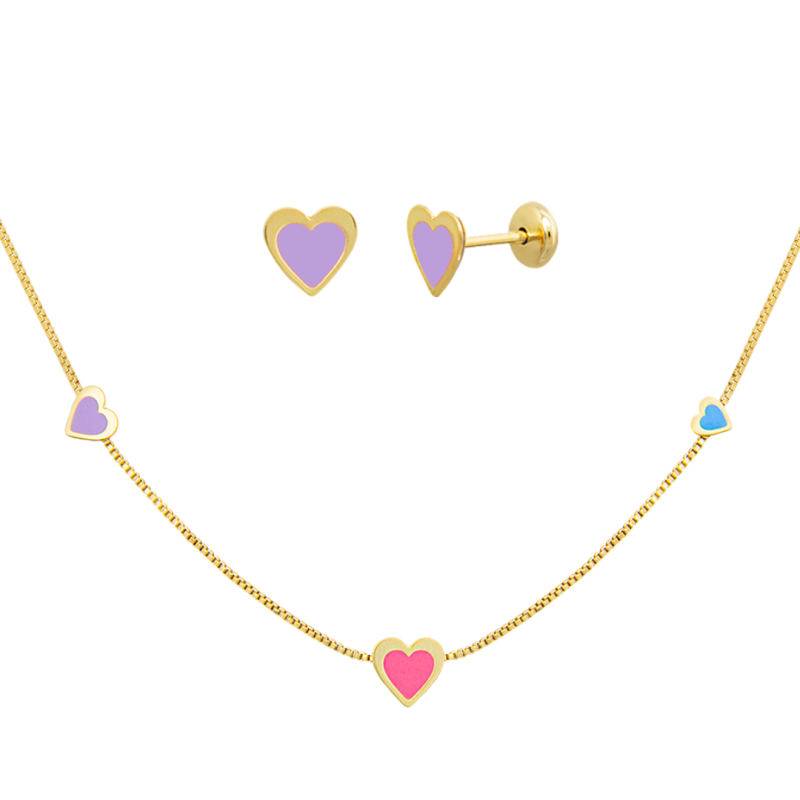O conjuntinho com brinco de coração resinado na cor rosa acompanhado de um colar com 3 corações resinados nas cores Lilás, Rosa e Azul. Semijoia banhada á ouro 18k revestida com uma camada exclusiva de verniz antialérgico. O brinco vem acompanhado com a tarraxa borboleta e a tarraxa baby.