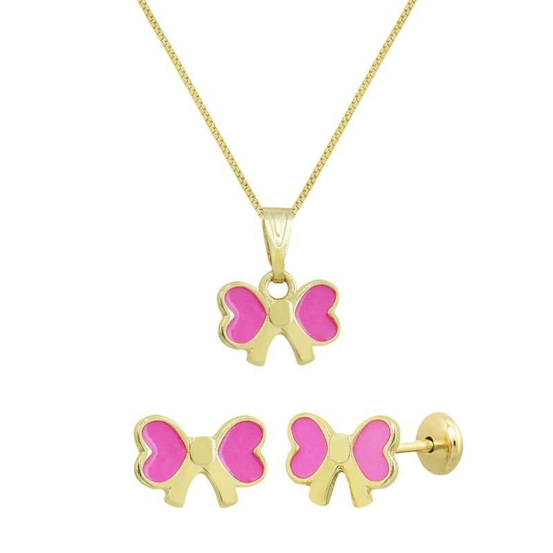 Encante sua pequena com este delicado conjunto de brinco e colar banhado em ouro, adornado com um lindo lacinho resinado em rosa que traz um toque de fofura, enquanto o banho em ouro confere um brilho especial. Ideal para ocasiões especiais ou para uso diário na escola. Todos os brincos da Jukkê acompanham duas tarraxas, a borboleta e a tarraxa baby, e como todos os produtos são de qualidade, possuem um ano de garantia, perfeito para presentear e revender. Aproveite! #PaisDeMenina #MamaeDeMenina #AcessorioInfantil!