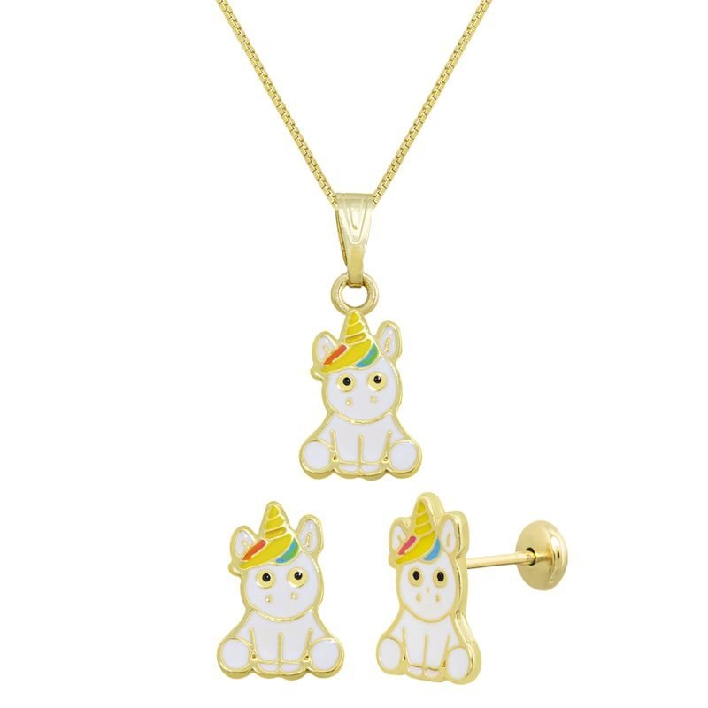 Conjunto infantil brinco e colar de Unicórnio resinado, com design fofinho e colorido, é banhado em Ouro e confeccionado com material antialérgico para garantir segurança e qualidade. Os brincos vem acompanhados com a tarraxa borboleta e a tarraxa baby para maior conforto e firmeza ao usar. Todas as semijoias Jukkê possuem um ano de garantia, que tal encantar sua pequena com essa semijoia delicada? Ideal para ocasiões especiais ou para uso diário com um toque mágico e encantador. Adquira já seu conjunto.