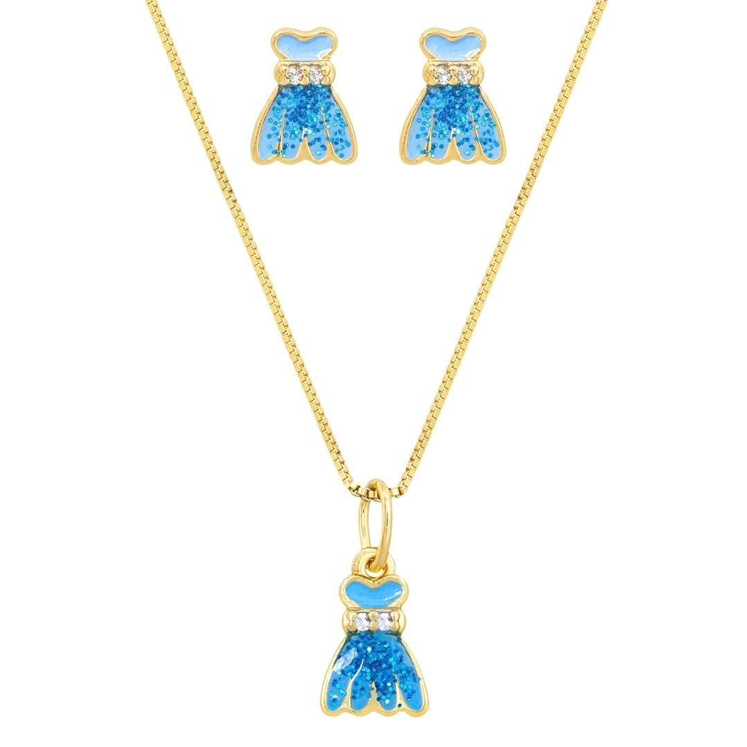 O conjuntinho com brinco e colar Vestido de princesa resinado em azul com glitter e duas pedrinhas cravejadas, para as meninas que amam princesas. Semijoia banhada á ouro 18k revestida com uma camada exclusiva de verniz antialérgico. O brinco vem acompanhado com a tarraxa borboleta e a tarraxa baby.