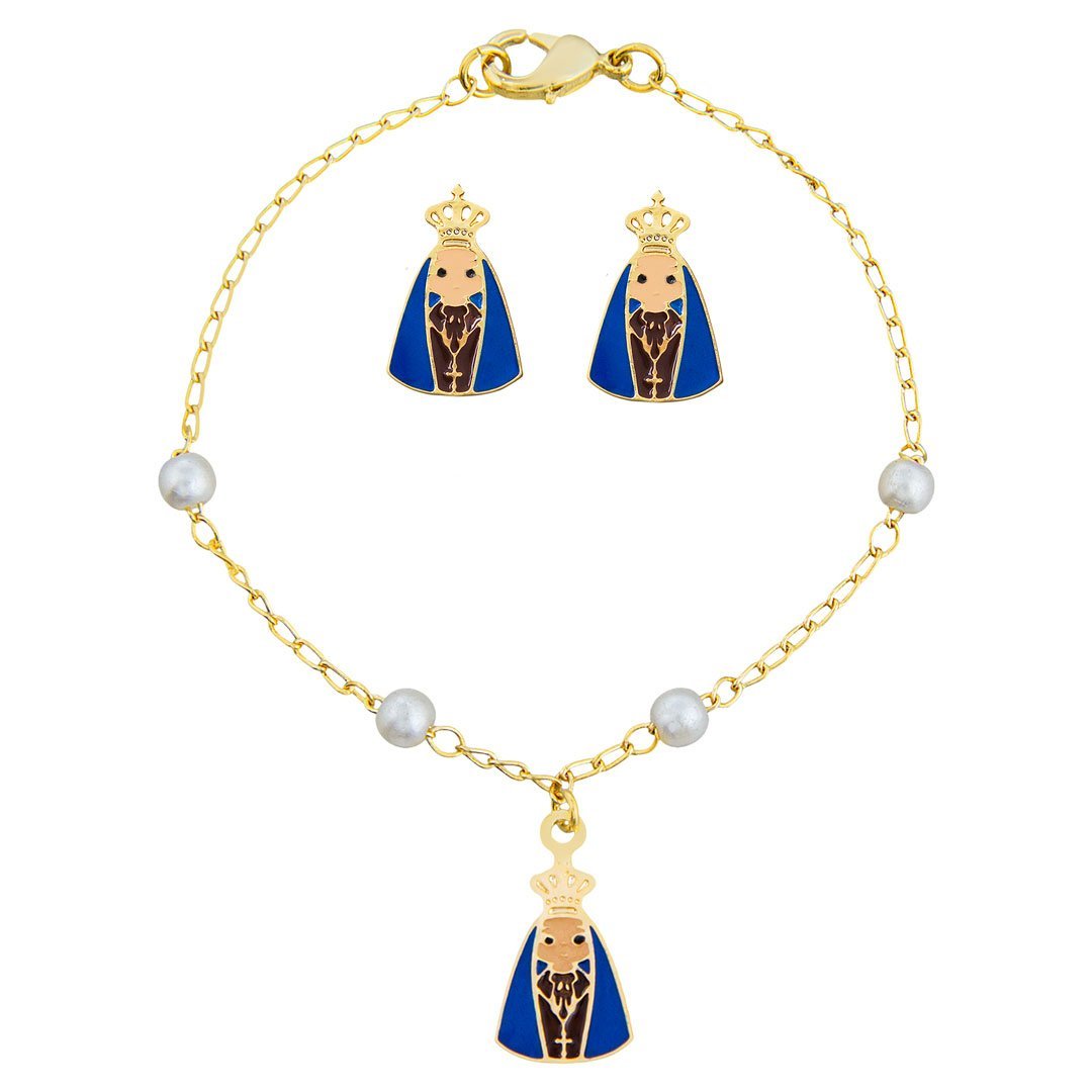 Conjuntinho Infantil com brinco e pulseira de pérolas da nossa mãezinha Nossa Senhora Aparecida resinada com a veste marrom e seu manto sagrado azul. Semijoia banhada á ouro 18k revestida com uma camada exclusiva de verniz antialérgico.Para garantir mais segurança e conforto, todos os nossos brincos acompanham a tarraxa borboleta e a tarraxa baby.