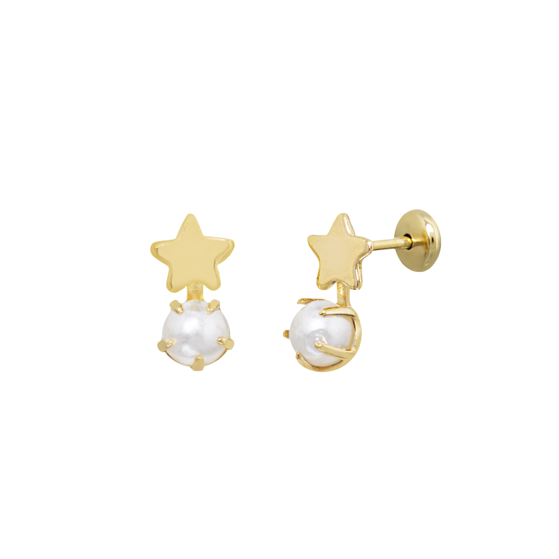 Brinco Infantil estrela lisa com pérola fixa embaixo. Semijoia banhada á ouro 18k revestida com uma camada exclusiva de verniz antialérgico.