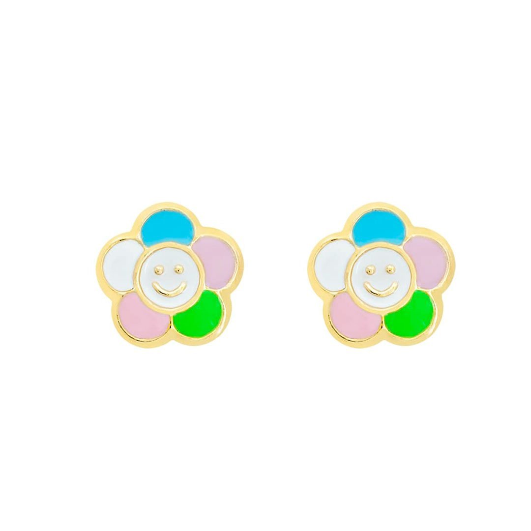 Brinco Infantil de Florzinha colorida com miolo de rostinho feliz resinado. Semijoia banhada á ouro 18k revestida com uma camada exclusiva de verniz antialérgico.