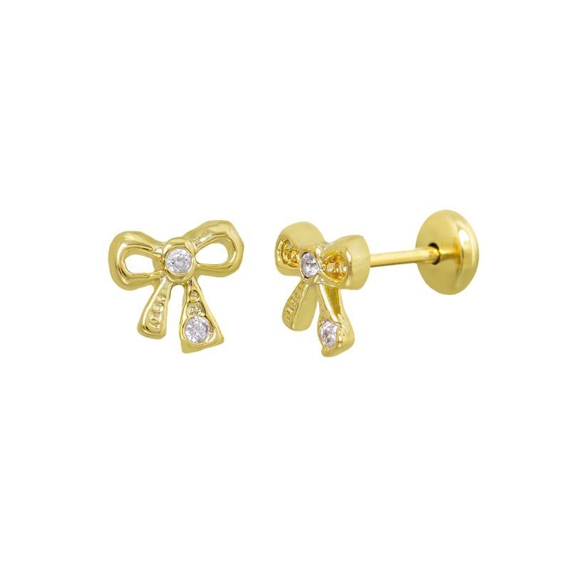 O brinco infantil de lacinho é cravejado com duas micro zircônias, sendo uma no centro e uma na ponta do laço, trazendo charme e um estilo bem princesinha. É uma semijoia banhada em ouro e revestida com uma camada exclusiva de verniz antialérgico. Para garantir mais segurança e conforto todos os nossos brincos acompanham a tarraxa borboleta e a tarraxa baby.