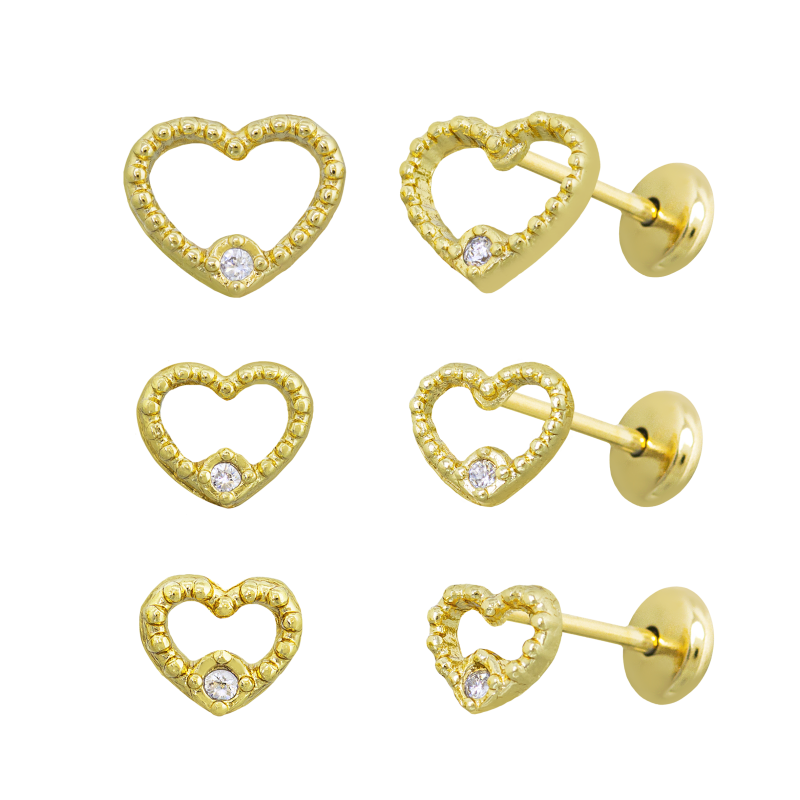 Encante a sua princesa com o Brinco Trio Coração Vazado com Pedrinha Zircônia - Banhado em Ouro. Com traços finos e delicados, este brinco é perfeito. Com pedra cristal em zircônia, design antialérgico e garantia de um ano, oferece encanto e beleza em uma única peça. Segurança e delicadeza combinadas para realçar a beleza da sua pequena. Acompanha tarraxa baby e tarraxa borboleta para garantir o conforto e segurança. Adquira já esse brinco encantador e proporcione à sua menina a delicadeza e o encanto que ela merece!