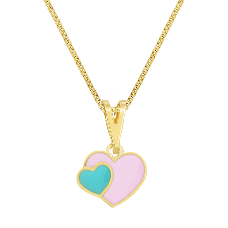 Colar Infantil Dois Corações resinados rosa e azul. Semijoia banhada á ouro 18k revestida com uma camada exclusiva de verniz antialérgico.