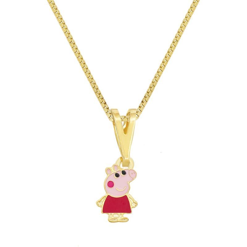Colar Infantil Peppa Pig resinada em rosa claro e vermelho. Semijoia banhada á ouro 18k revestida com uma camada exclusiva de verniz antialérgico.Para a maior tranquilidade das mamães, os colares vêm com um extensor para regular o tamanho que desejar.