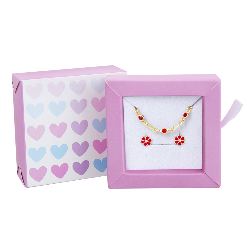 Este conjuntinho de florzinha e pedrinhas vermelhas é composto por um par de brincos de flor resinado em vermelho e uma delicada pulseirinha com pedrinhas vermelhas banhadas a ouro. Os brincos possuem um design adorável, e acompanham a tarraxa borboleta e a tarraxa baby. A pulseirinha é feita com pedrinhas vermelhas em formato redondo, proporcionando um visual sofisticado e gracioso, é um conjunto perfeito para sua pequena se sentir uma verdadeira fashionista.