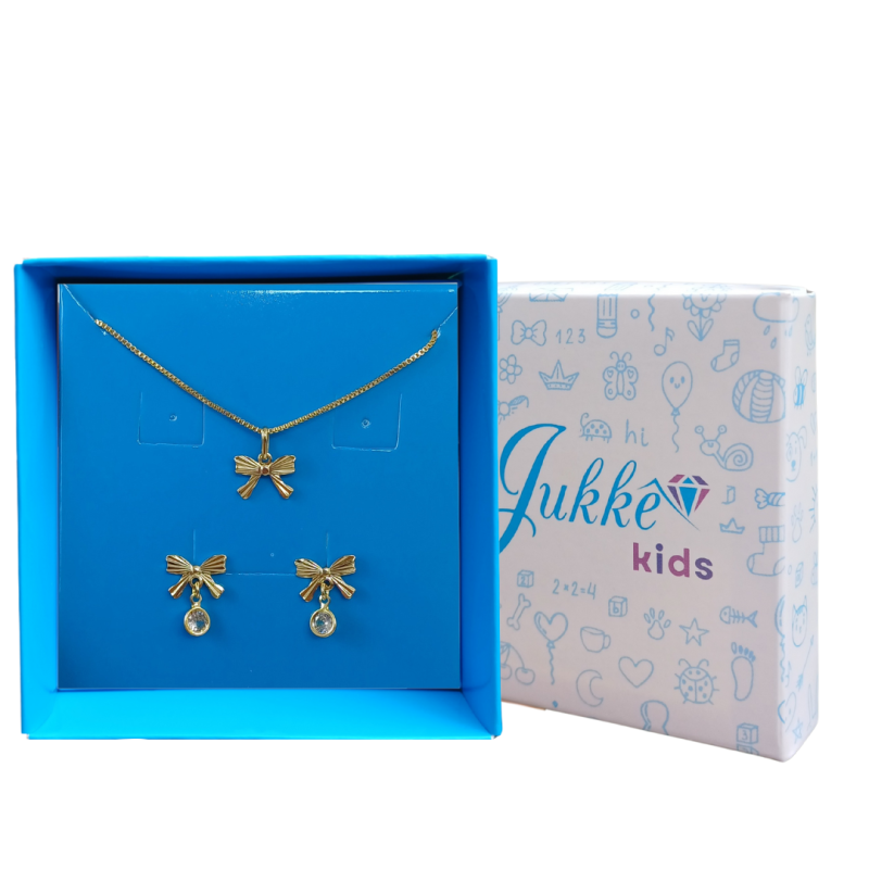 Um charme irresistível para meninas delicadas! O Conjunto Infantil Brinco com Pedra e Colar Laço Diamantado Banhado a Ouro combina segurança, conforto e elegância em cada detalhe. Com um design único, o brinco traz uma preciosa pedra de zircônia cristal e o colar um pingente de laço diamantado, perfeitos para o dia a dia ou momentos especiais. Além de ser uma semijoia hipoalergênica e contar com uma camada de verniz para maior durabilidade, o conjunto oferece máxima segurança com tarraxas baby e borboleta. Inclui garantia de um ano para tranquilidade total. Acompanhado de uma caixinha de presente encantadora, decorada com corações em tons suaves e um delicado puxador de fita de cetim, é perfeito para presentear ou revender. Emoção à primeira vista e irresistível até o último detalhe. Garanta esse presente especial que transmite carinho e sofisticação com cada peça!