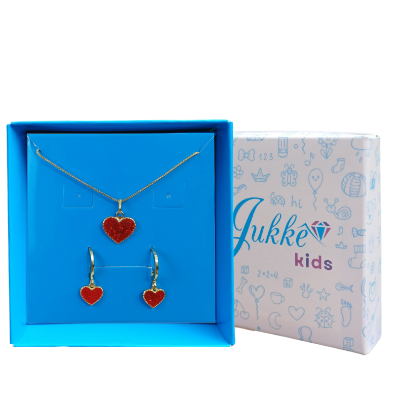 Surpreenda com brilho e elegância! Esse lindo conjunto infantil, com brinco argolinha e colar resinado com glitter vermelho, é perfeito para meninas que amam um toque de glamour. Banho de ouro aliado à camada de verniz garantem maior durabilidade, enquanto os materiais hipoalergênicos oferecem conforto e segurança para peles delicadas. O acabamento brilhante e o design com coração tornam esse conjunto um verdadeiro charme para qualquer momento especial. Além disso, ele vem em uma caixinha de presente estilosa, decorada com corações em tons de rosa, lilás e azul, perfeita para presentear. A embalagem possui um delicado puxador de fita de cetim e uma almofadinha branca que complementa o luxo. Benefícios incríveis para o dia a dia, semijoias hipoalergênicas para máxima segurança e conforto, um ano de garantia, porque qualidade é prioridade. Encante quem você ama com esse brilho único ou aproveite para revender uma semijoia que exala beleza e elegância!