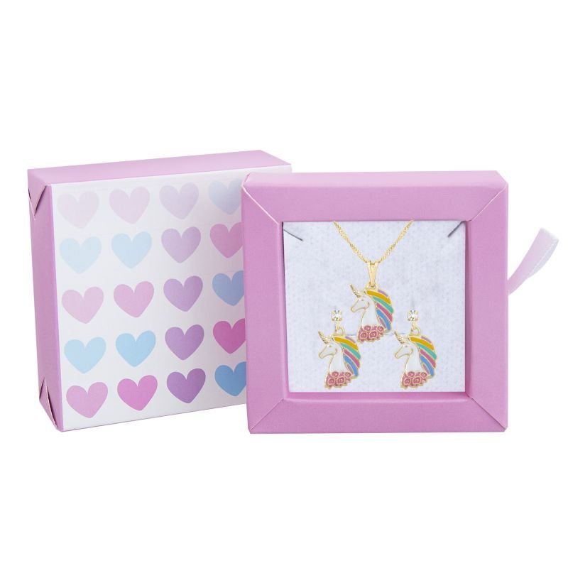 Encante sua pequena com o Conjunto Infantil Brinco e Colar Unicórnio Banhado em Ouro! Com um par de brincos com base em zircônia cristal de unicórnio e uma corrente singapura com um lindo pingente colorido resinado, essa semijoia é a escolha perfeita para crianças que adoram moda, os brincos vêm acompanhados com tarraxa borboleta e tarraxa baby para garantir o conforto e segurança. O kit inclui uma caixinha de presente com corações desenhados nas cores rosa, lilás e azul. Essa embalagem é estilo gavetinha com puxador de fita de cetim, modelo ideal para presentear. Dentro acompanha uma almofadinha branca. Além disso, as peças são banhadas em ouro 18k, antialérgicas e vêm com um ano de garantia. Não perca a chance de dar à sua princesa um presente mágico!