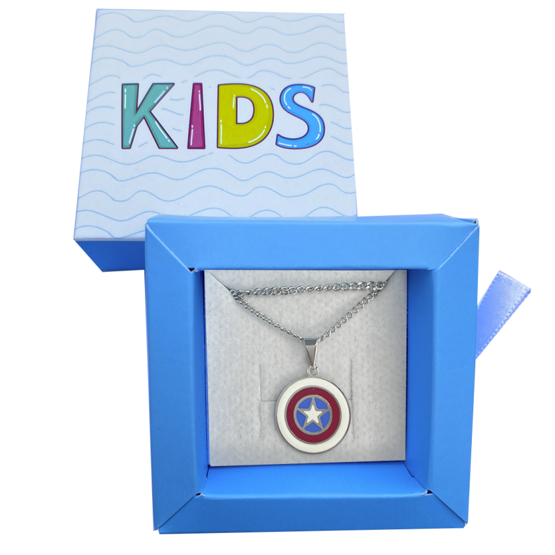 Conjuntinho inspirado no personagem Capitão América, resinado nas cores branco, vermelho e azul. Modelinho ideal para os meninos que são fãs de super heróis. O conjunto é formado por uma pulseira em aço inox antialérgico e uma corrente com pingente lúdico. Esse kit acompanha uma caixinha de presentecom letras coloridas formando a palavra KIDS, nas cores azul, verde, rosa e amarelo. Essa embalagem é estilo gavetinha com puxador de fita de cetim, modelo ideal para presentear.. Semijoias antialérgicas e com UM ano de garantia.