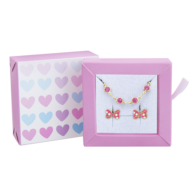Este conjunto infantil de laço rosa com pulseira de pedrinhas na cor rosa são banhadas a ouro para crianças foi desenvolvido pensando na vaidade e no estilo das pequenas fashionistas, esse conjunto é perfeito para complementar diversos looks com charme e delicadeza. Os brincos, em formato de laço rosa, são resistentes e hipoalergênicos, garantindo conforto e segurança para as orelhinhas sensíveis das crianças. O banho em ouro proporciona um brilho especial, conferindo um toque sofisticado a cada peça. A pulseira, com suas delicadas pedrinhas banhadas a ouro, adiciona um toque de brilho e glamour ao conjunto. A pulseira se adapta perfeitamente ao pulso das crianças, garantindo conforto durante todo o dia. Para tornar o presente ainda mais especial, o conjuntinho é acompanhado por uma encantadora caixinha de presente com corações, garantindo que presente seja especial.