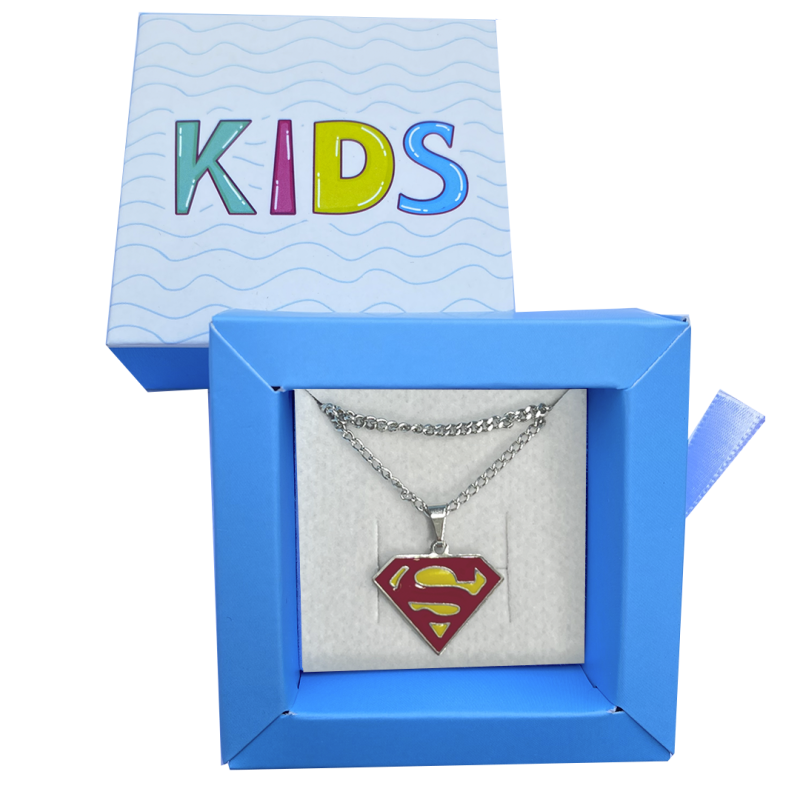 Conjuntinho inspirado no Super Homem, resinado em vermelho e amarelo. Modelinho ideal para os meninos que são fãs de super heróis. O conjunto é formado por uma pulseira em aço inox antialérgico e uma corrente com pingente lúdico. Esse kit acompanha uma caixinha de presentecom letras coloridas formando a palavra KIDS, nas cores azul, verde, rosa e amarelo.Essa embalagem é estilo gavetinha com puxador de fita de cetim, modelo ideal para presentear.Dentro acompanha uma almofadinha de courino branco.. Semijoias antialérgicas e com UM ano de garantia.