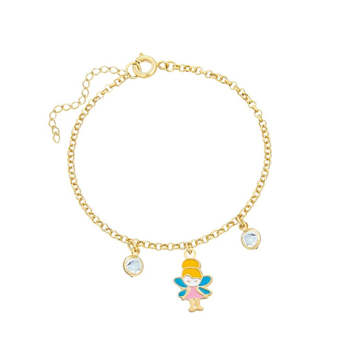 Pulseira infantil de Fada resinada com duas pedrinhas nas laterais, podendo variar entre crista e rosa. Semijoia banhada á ouro 18k revestida com uma camada exclusiva de verniz antialérgico.