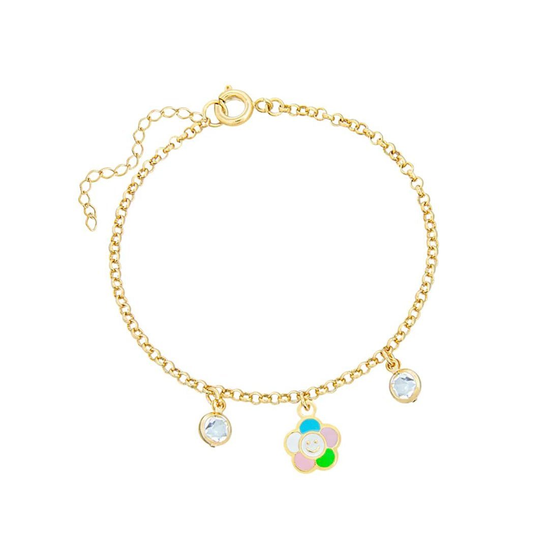 Pulseira infantil de Florzinha com as pétalas coloridas e o miolo com rostinho feliz resinado com duas pedrinhas nas laterais. Semijoia banhada á ouro 18k revestida com uma camada exclusiva de verniz antialérgico.