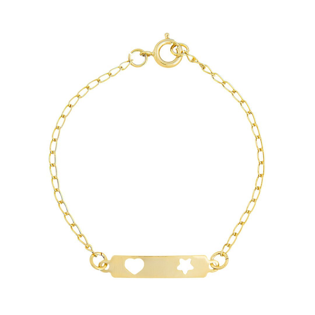 Pulseira infantil plaquinha com coração e estrelinha vazadas. Semijoia banhada á ouro 18k revestida com uma camada exclusiva de verniz antialérgico.