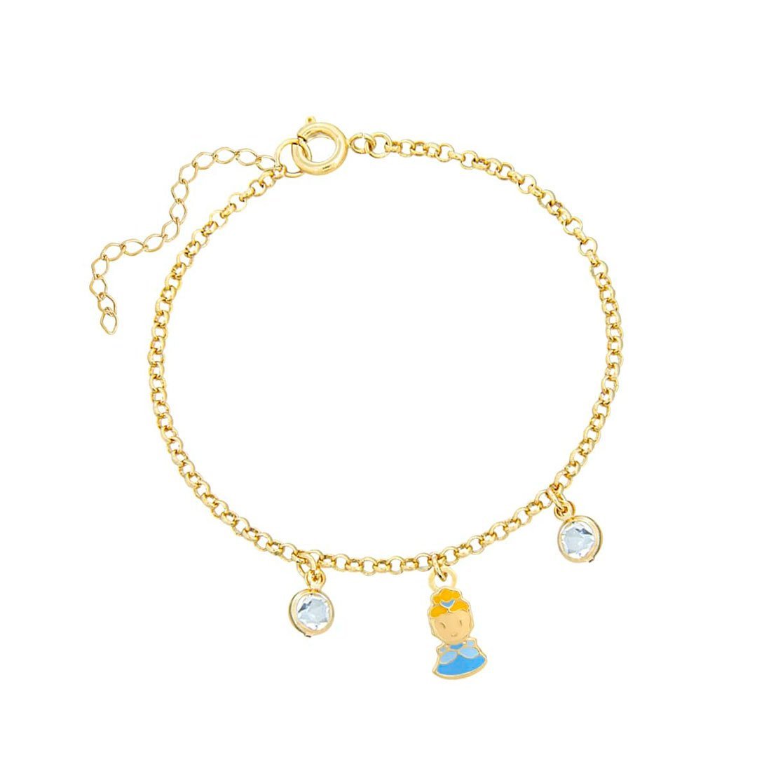 Pulseira infantil Princesa com Vestido Azul resinado com duas pedrinhas nas laterais. Semijoia banhada á ouro 18k revestida com uma camada exclusiva de verniz antialérgico.